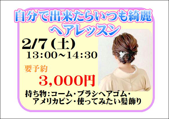 2/7ヘアレッスン 自分で出来たらいつも綺麗! 2/7ヘアレッスン 自分で出来たらいつも綺麗! 2/7 ヘアレッスン 自分で出来たらいつも綺麗!女将おススメのヘアセットアイテムをプレゼント!「これがあれば絶対安心」 ご予約はお早めに フリーダイヤル tel:0120-07-5291 営業時間10:30~19:00(定休日:火曜日・水曜日)